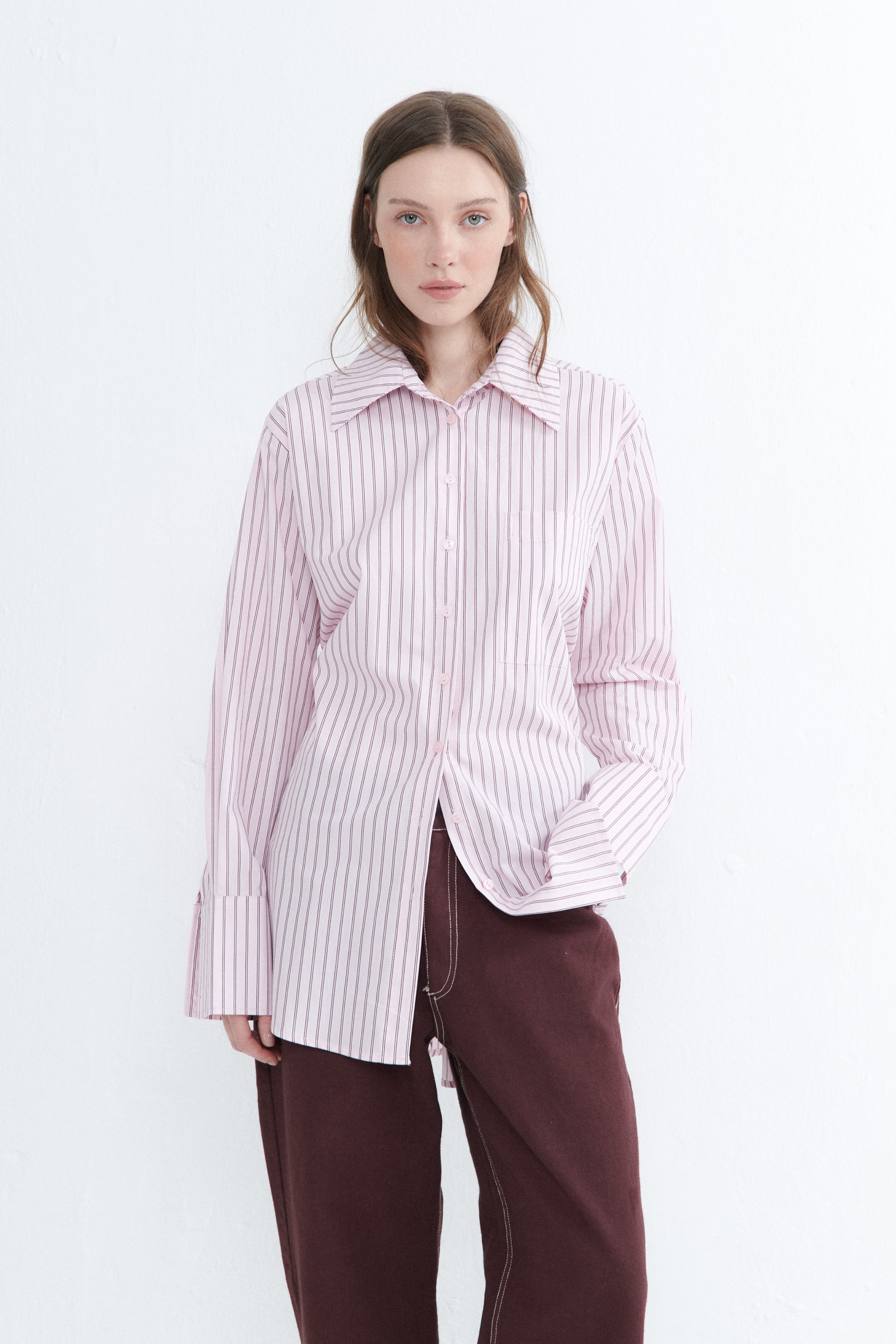 DESCRIPCIÓN: Camisa de poplín de fit amplio. Detalle de tiras en los laterales de la misma tela para ajustar en cintura. Puños anchos. Detalle de tablón en espalda. Bolsillo amplio en el delantero.