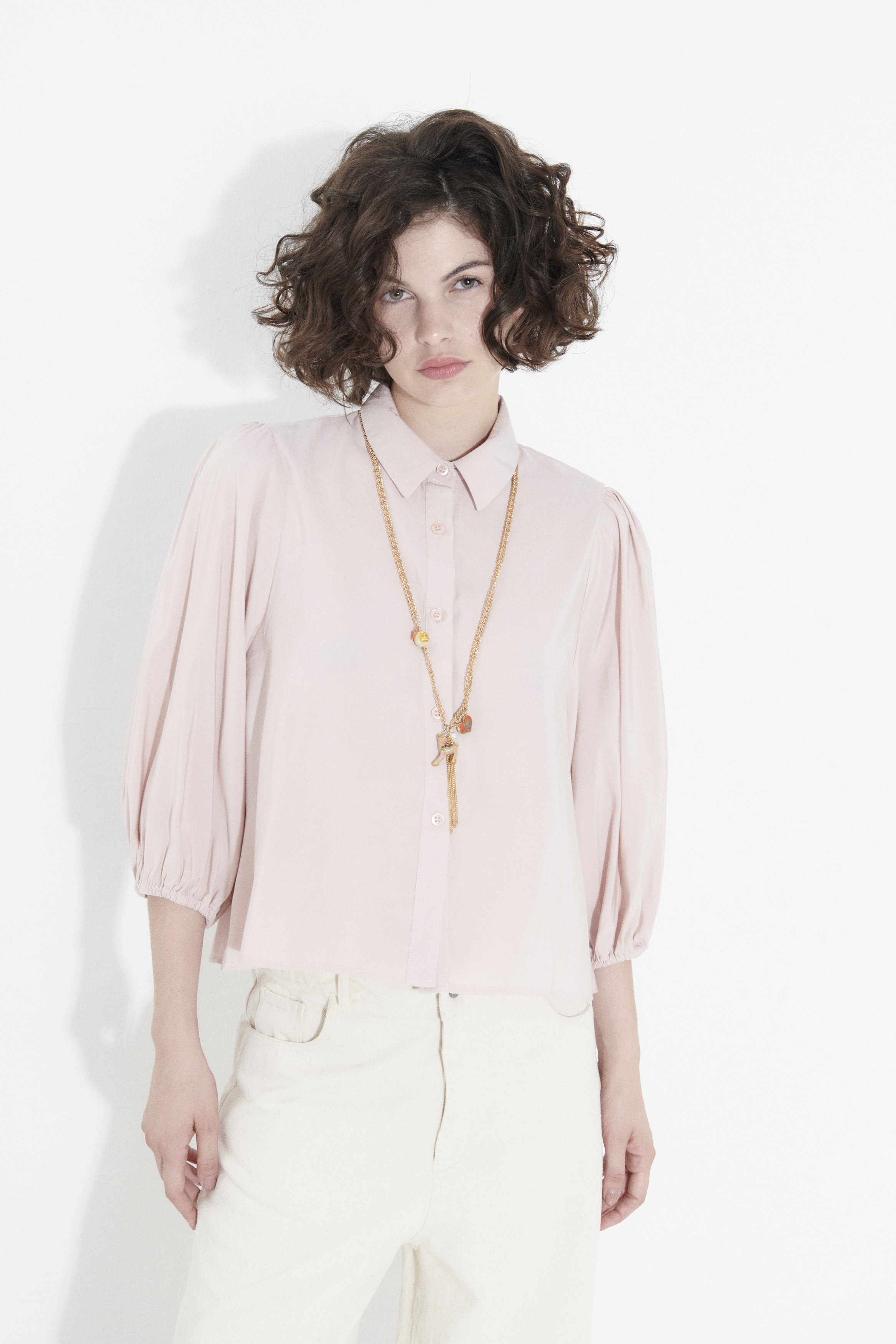 DESCRIPCIÓN: Camisa de tela simil cupro, súper suave y con cuerpo, mangas balloon 3/4, con elástico en el puño, corte evasé.