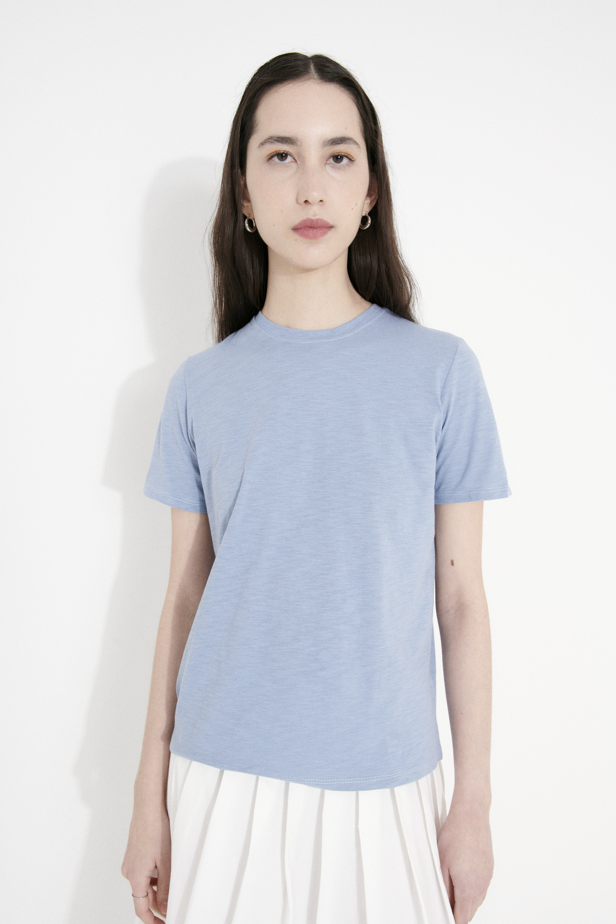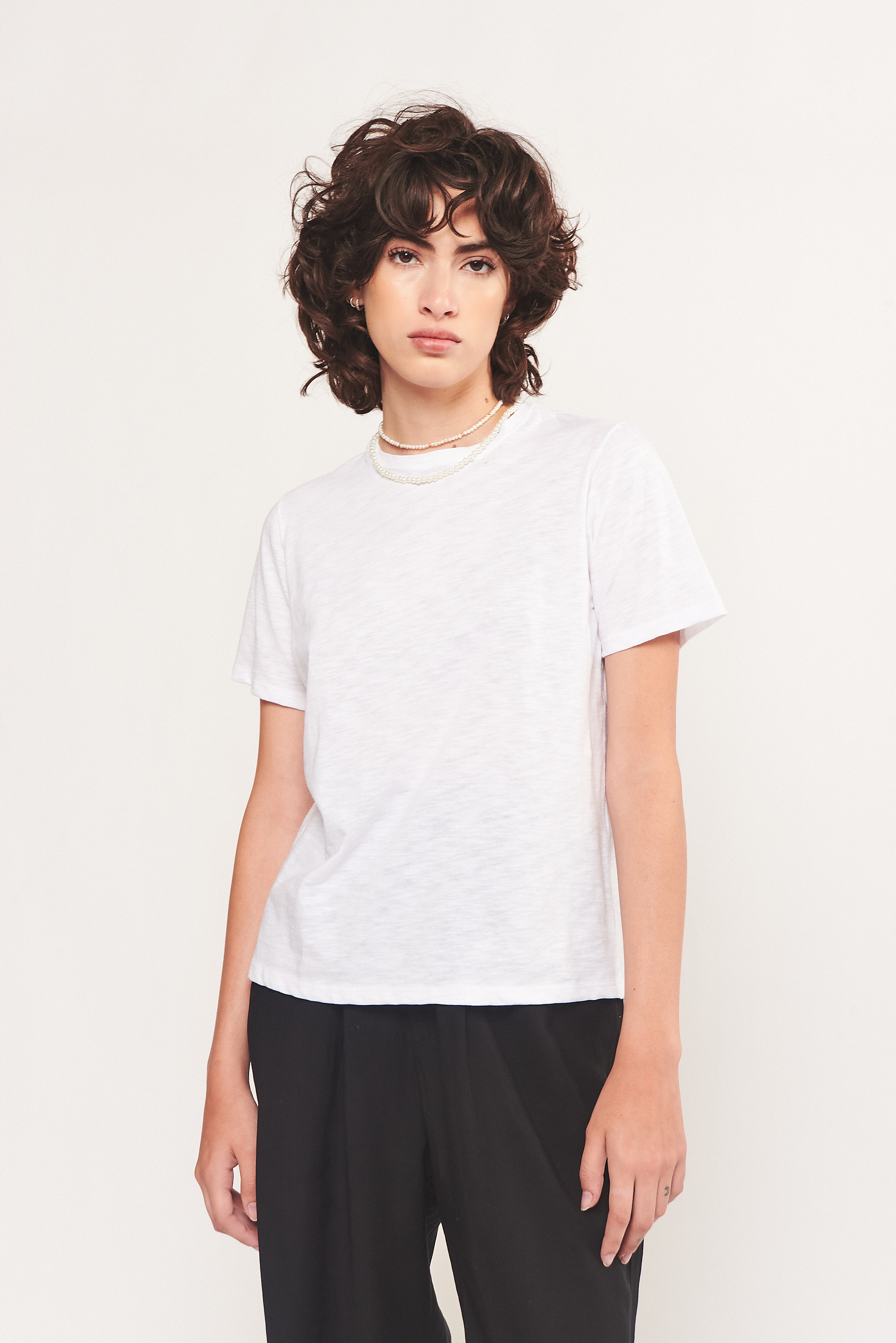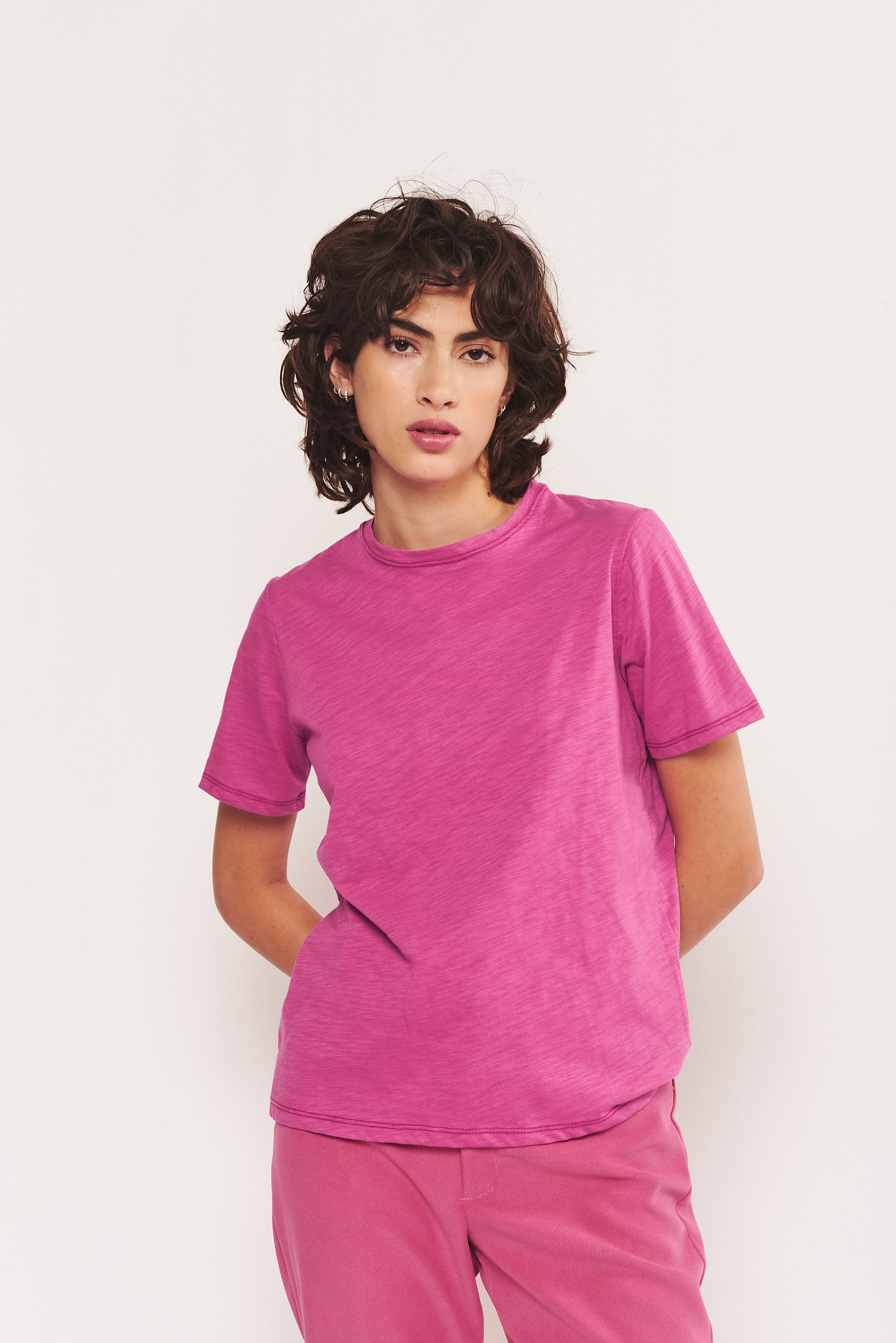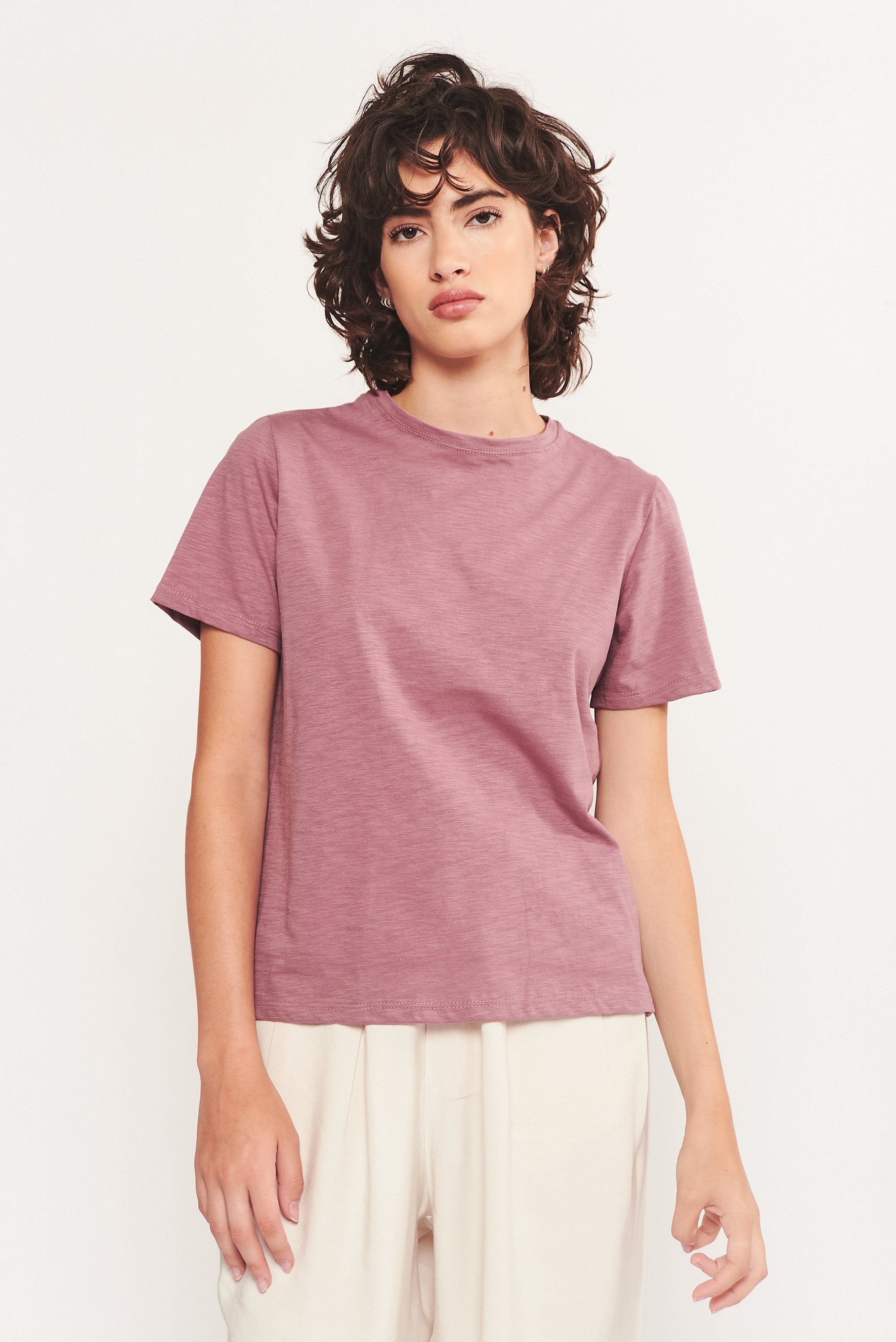 DESCRIPCIÓN: Remera básica de jersey de flamé peruano. Escote cerrado y manga corta, con detalle de doble pespunte en escote.
