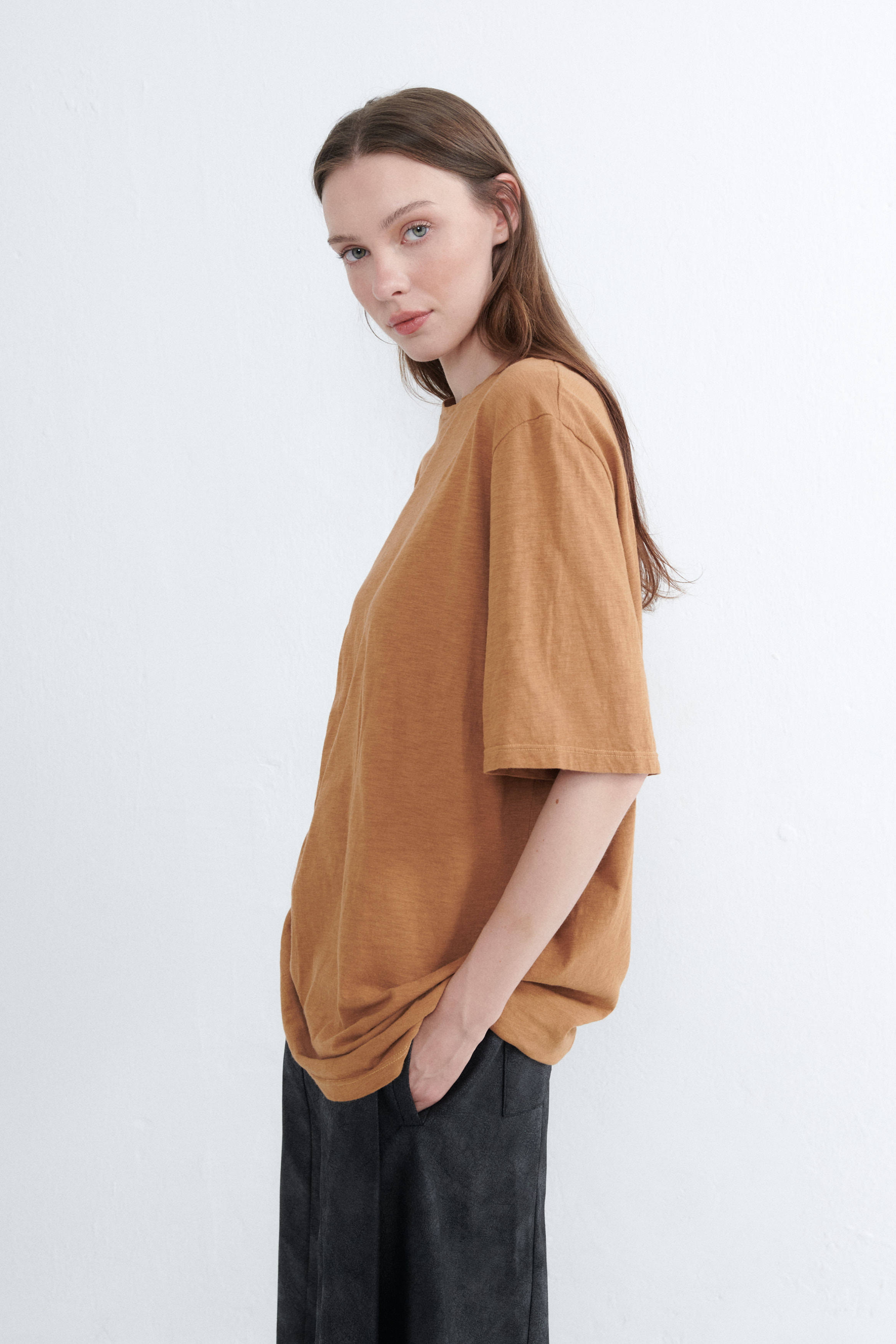 DESCRIPCIÓN: Remerón básico de jersey de flamé peruano. Escote cerrado y manga por encima del codo, largo por debajo de la cola, prelavados para que no se te encoja.