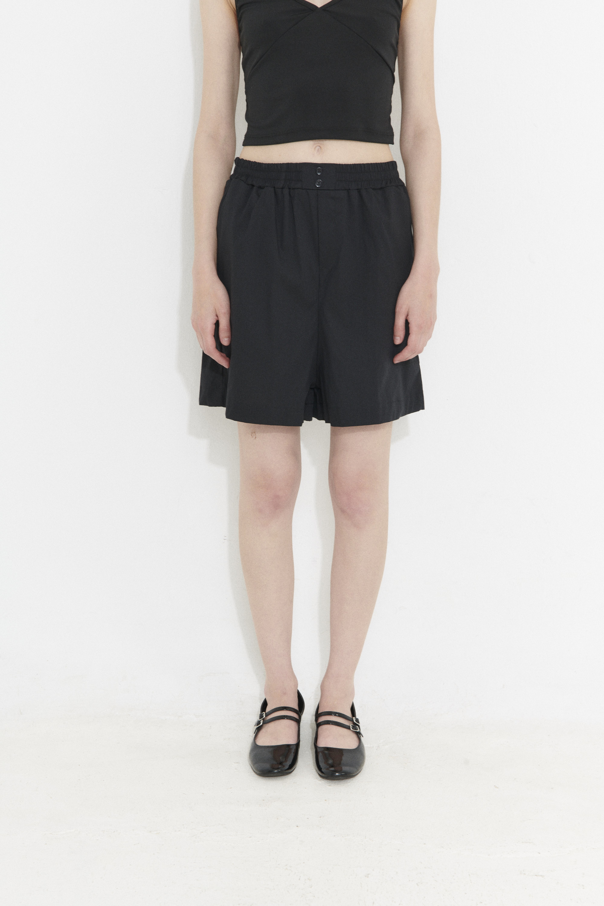 DESCRIPCIÓN: Short de poplín con elástico en la cintura que simula un boxer. Bolsillos en los laterales. Detalle de botones falsos en cintura. Evasé y larguito.