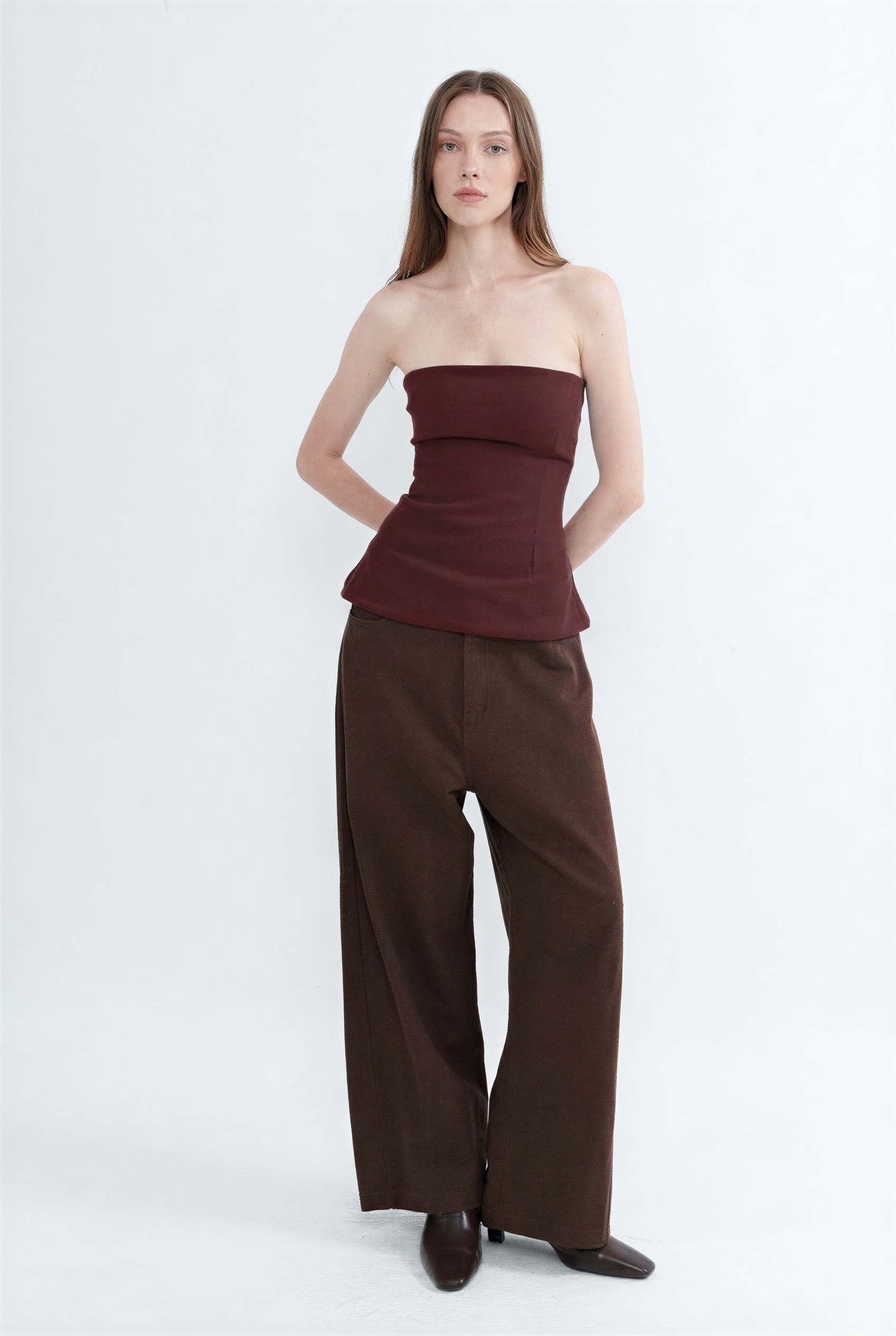DESCRIPCIÓN: Strapless confeccionado en bengalina que le da estructura y agarre a la prenda. Esta confeccionado doble y con pinzas. Detalle de corte peplum.