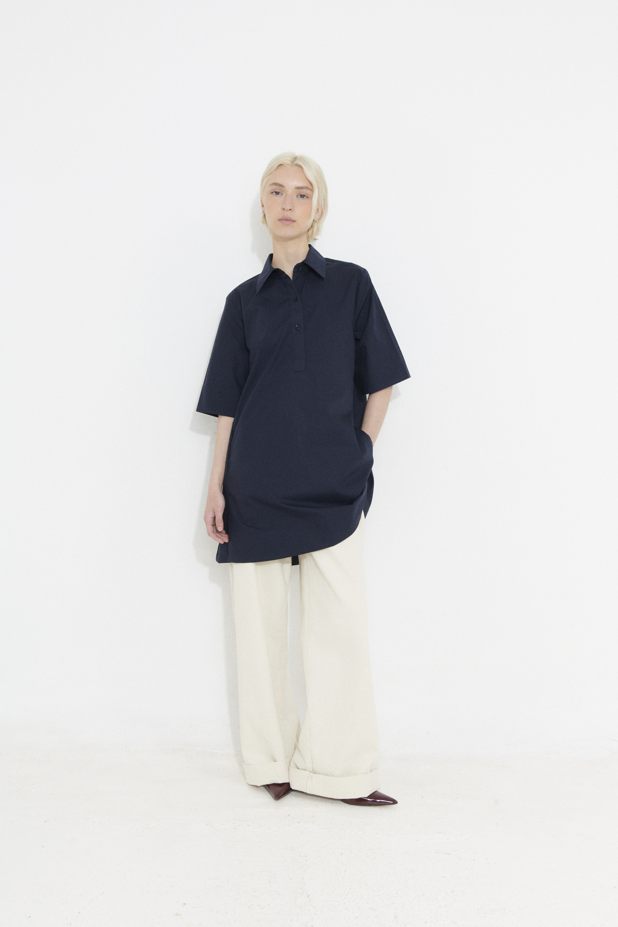 DESCRIPCIÓN: Vestido evasé manga corta, confeccionado en poplín estructurado. Ruedo súper ancho y cartera con botones a tono. Bolsillos en los laterales.